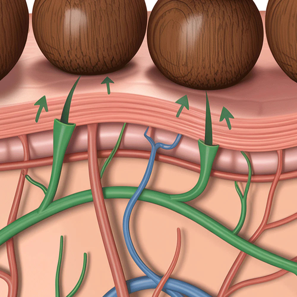 De 20 stimulerende træperler i TheraWood™ arbejder på hudens dybere lag og stimulerer intensivt mikrocirkulationen.